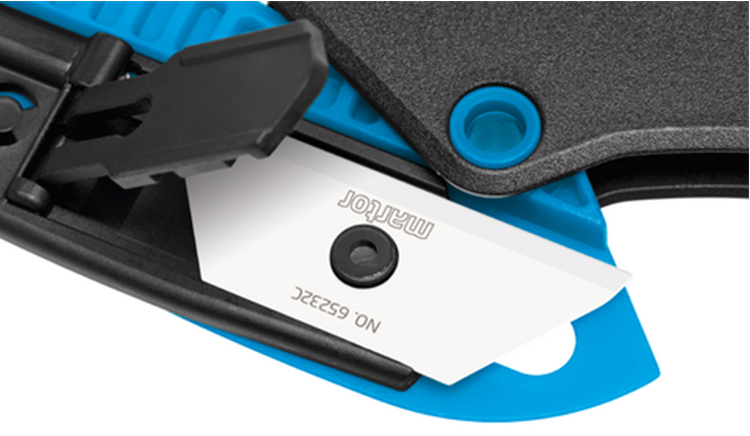 無需額外工具便可更換刀片,且完全無需拆卸。相反:按下刀片更換按鈕并完全翻開藍色壓桿,即可更換刀片。