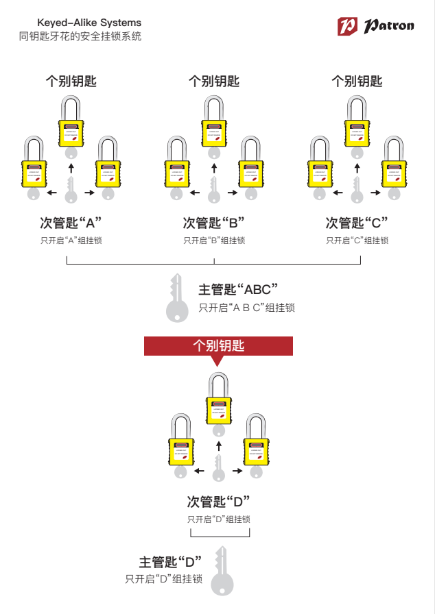 在大型的生產(chǎn)埸地中往往遇上一個工程師操控多臺設(shè)備的情況。傳統(tǒng)上,他們將需要單獨(dú)的鑰匙來打開每把掛鎖,這樣對工程師來說自然增加額外的操作時間和其他的不方便。這時一套鉑鉺盾(Patron)相同鑰匙牙花的安全掛鎖便讓這項工作變得非常容易。