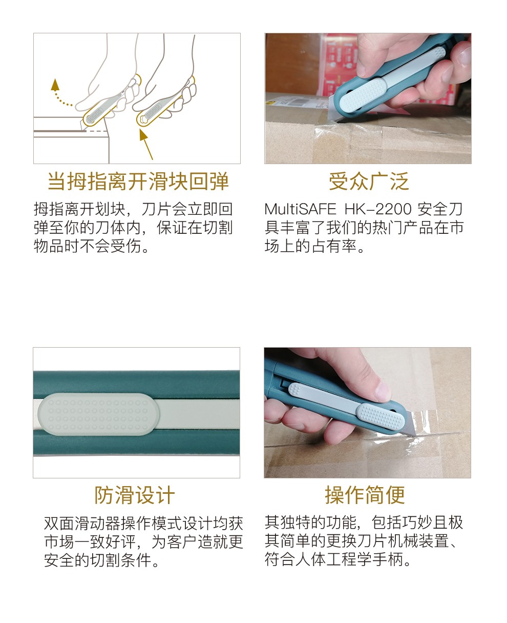 HEWER 很高興地宣布推出我們革命性的全新MultiSAFE HK-2200輕巧型安全刀具。這款創(chuàng)新、靈巧的安全刀具豐富了我們廣受歡迎的開箱刀系列,并自豪地專為工廠、辦公室及家庭應(yīng)用而設(shè)計(jì)。獨(dú)特的功能包括設(shè)計(jì)巧妙且極其簡單的刀片更換系統(tǒng)。其他亮點(diǎn)包括其人體工程學(xué)手柄,其中單側(cè)滑塊設(shè)計(jì)讓左、右撇子亦能靈活使用。。