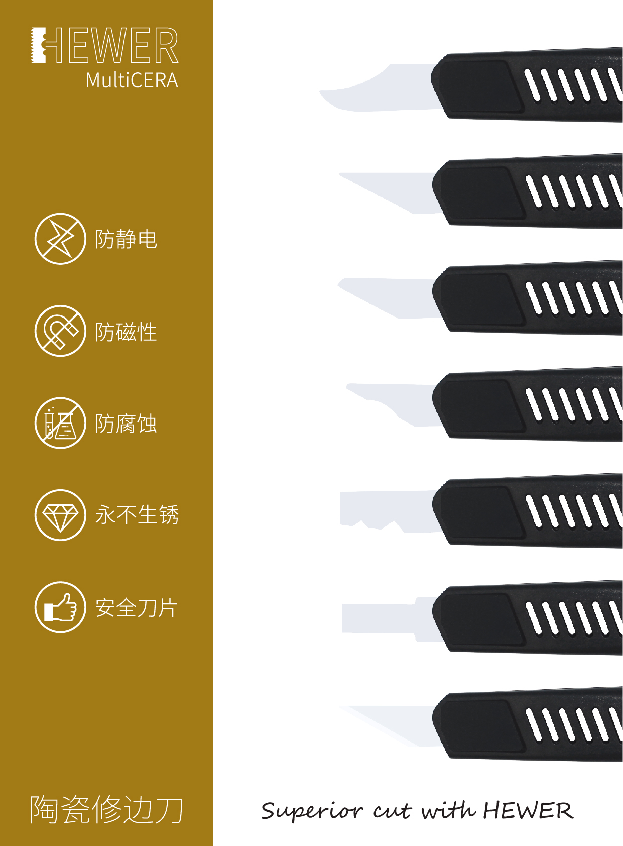 HEWER MultiCERA 安全陶瓷修邊刀可配合多款不同形狀的刀片使用,讓您在不同角度下進行工作。而其刀柄除了采用超耐用的玻璃尼龍材質(zhì),還附有備用刀片庫,可讓您輕易地在多款刀片之間進行切換,方便又好用!HEWER MultiCERA 安全陶瓷修邊刀擁有特別設計的纖細刀柄,可讓您以各種刁鉆的角度,將刀片伸至許多難以觸及的地方來進行切割作業(yè)。