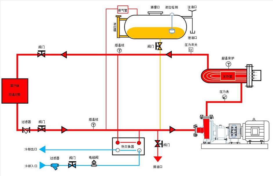 后,重新通過循環(huán)泵,回到加熱器,再吸收熱量,傳遞給用熱設備,如此周而復始,實現(xiàn)熱量的連續(xù)傳遞,使被加熱物體溫度升高,達到加熱的工藝要求.